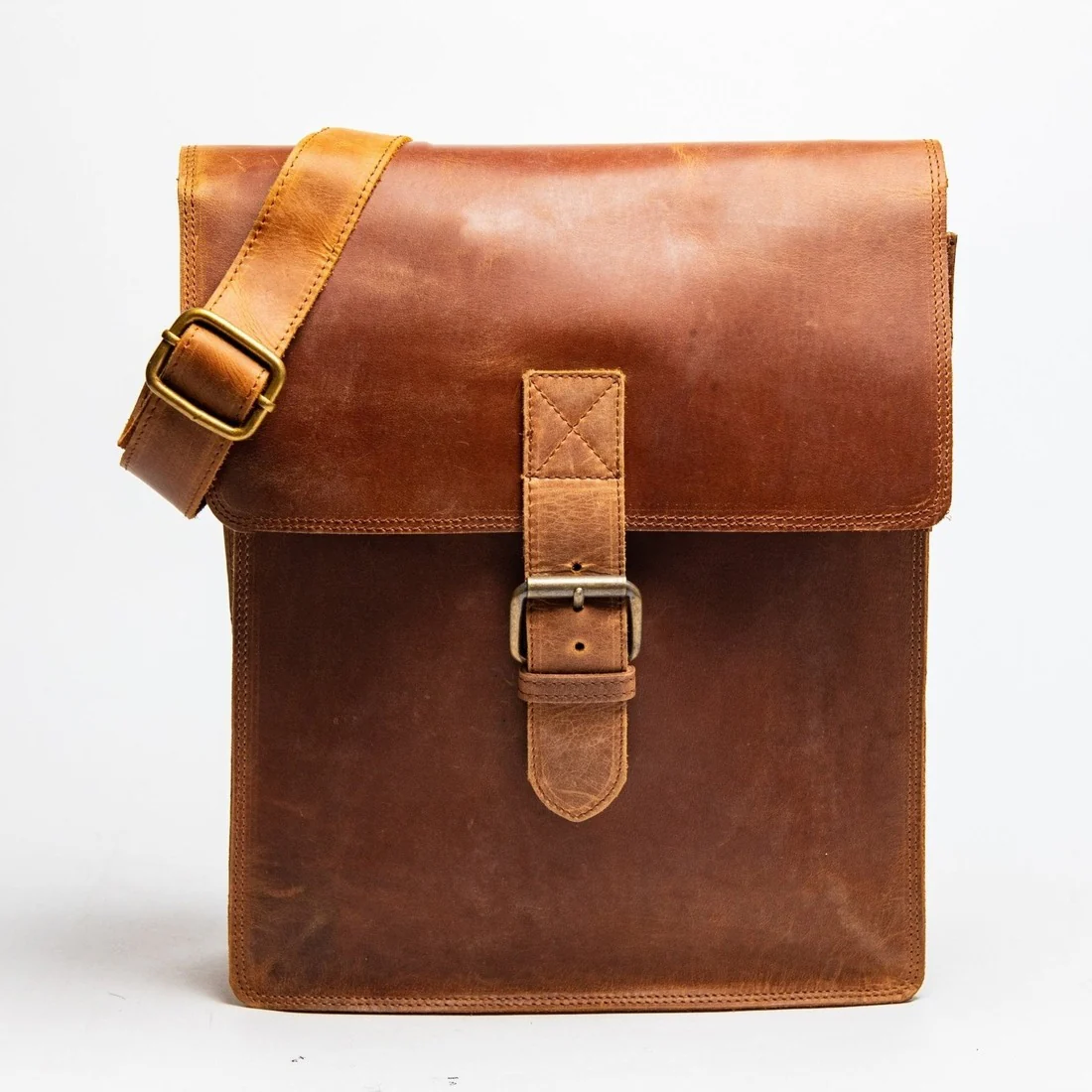 The Montreal Leather Satchel in Saddle Brown is a classic postman bag. Its rectangular shape and full-grain leather craftsmanship represent old fashion and durability. Comes in 2 different sizes and a vintage-style buckle strap concealing a push-lock. fits a 14-inch laptop perfectly.